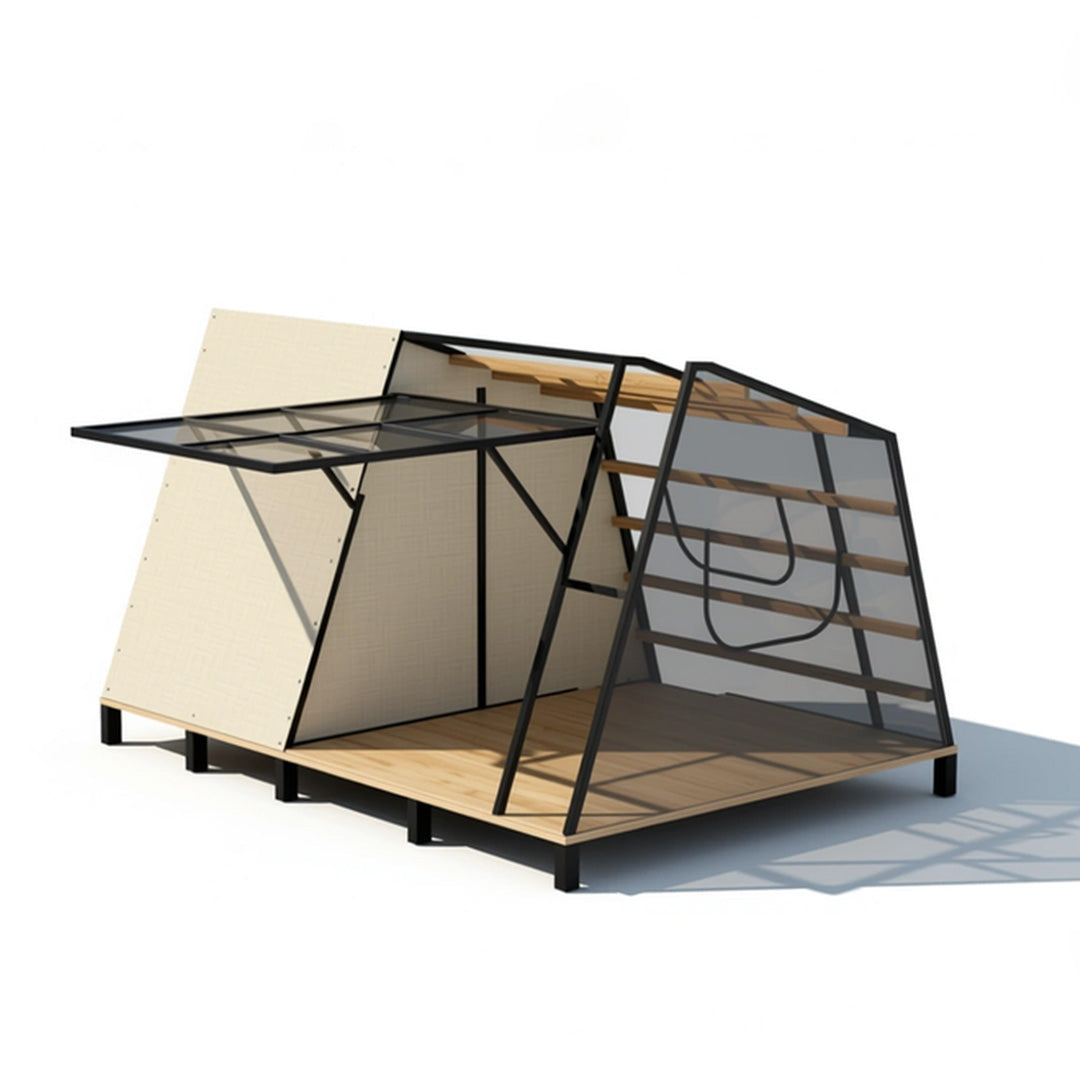 The Cicada Horizon is a biophilic masterpiece defined by its distinctive, sweeping "winged" roofline that mimics the sleek profile of a cicada in flight. It utilizes a high-tension fabric canopy over a modular galvanized steel frame to create expansive, shaded outdoor living areas that double the unit's usable square footage.