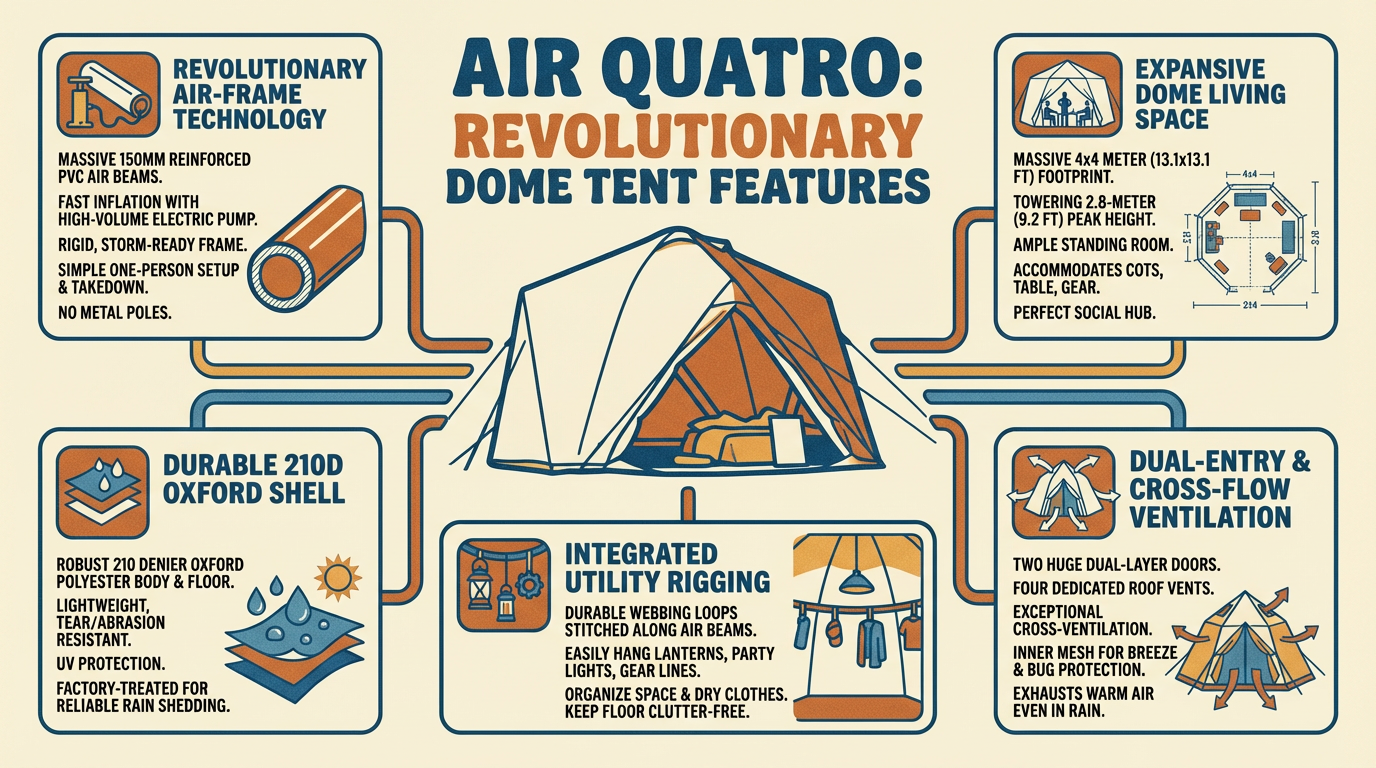 The Trend Tents Air Quatro redefines what a large shelter can be. Powered by a rock-solid inflatable frame, it delivers massive interior space without the hassle of a single pole. Unpack, inflate, and start your adventure. It's the ultimate hassle-free solution for families, groups, and anyone who values their time in the great outdoors.