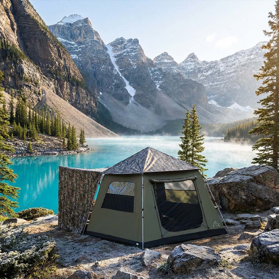 Instant canvas fortress — 10-second auto-lock setup, 8-foot walk-in headroom, and blackout rainfly technology. From bag to basecamp in seconds.
