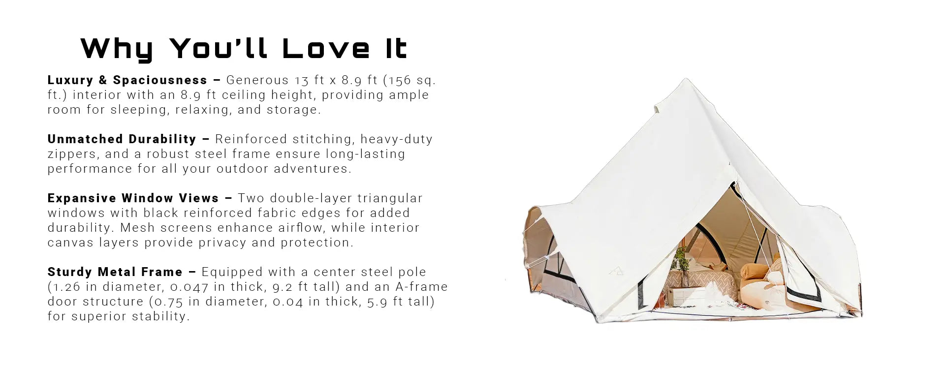 The Brisa is a statement piece, not just a shelter. Soaring to a massive 9-foot peak, this Lotus-style canvas cathedral redefines campsite luxury with its sweeping curved eaves and panoramic arched windows. Anchored by a heavy-duty steel frame and breathable cotton canvas, it offers a walk-in height of nearly 6 feet and a sprawling 13x10 floor plan. It’s designed for those who want to stand tall, breathe easy, and wake up to a room with a view.