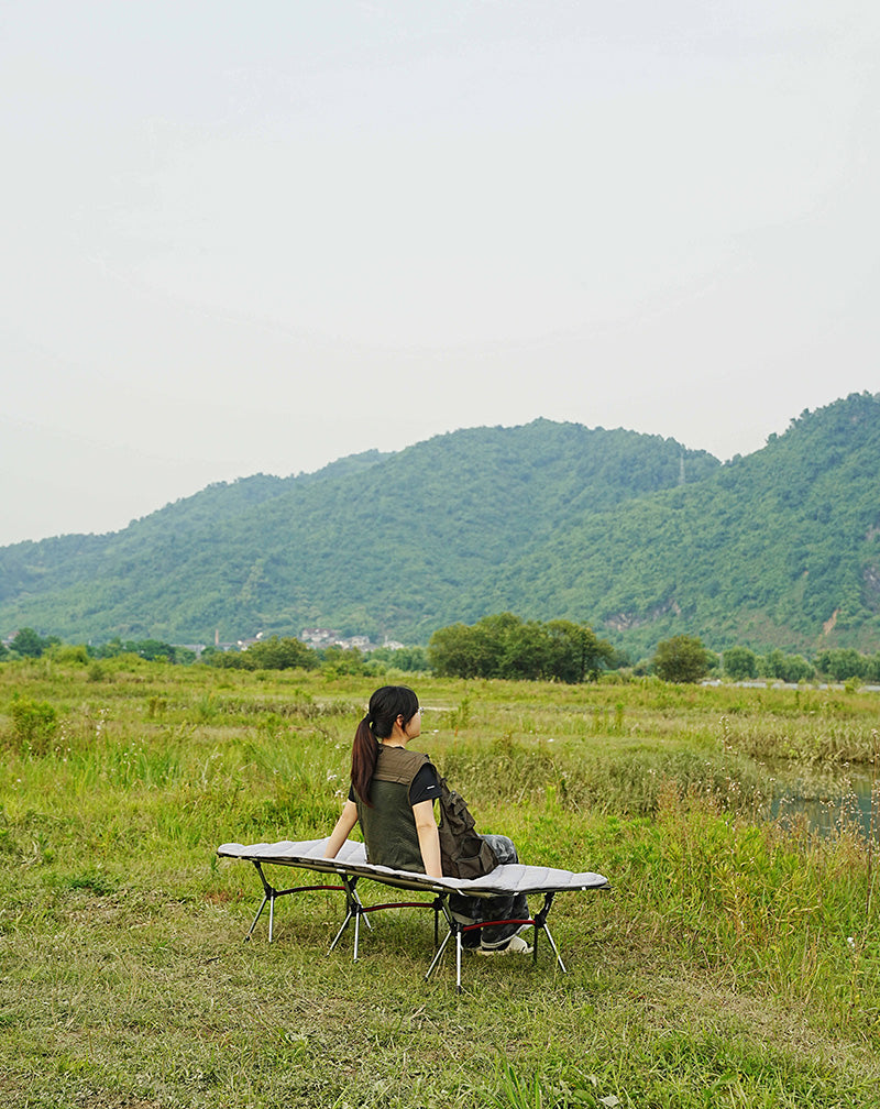 Experience bed-like comfort anywhere with the ultra-portable Camp Cot. This cot provides a full-length 75 × 25 inch sleeping surface supported by a feather-light 6.5 lb (3 kg) aircraft-grade aluminum frame, capable of supporting up to 265 lb (120 kg). Engineered for speed and convenience, it features tool-free click-lock assembly in under two minutes and offers dual-height settings—a low 15 cm lounge mode and a raised 38 cm sleep mode. Paired with a durable, breathable 600D Oxford polyester deck, the cot packs down tightly to a compact Ø 8 × 20 inch duffel, making it the perfect lightweight sleeping solution for any adventure.