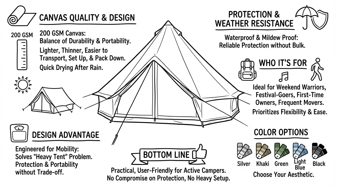 Our 200 GSM canvas is designed for the camper who values portability without sacrificing protection. This fabric is lighter and thinner than traditional heavy canvas, making it significantly easier to transport, set up, and pack down. It dries faster after a rainstorm while providing a fully reliable barrier against the elements.