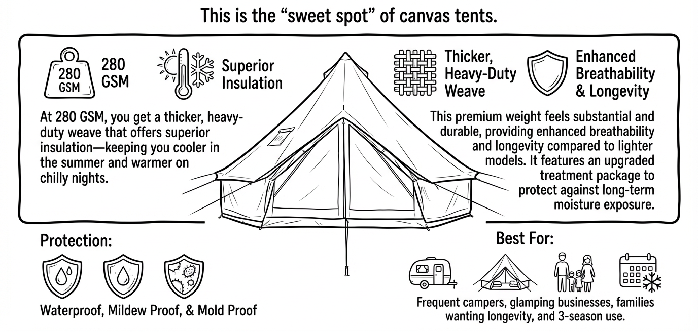 This is the "sweet spot" of canvas tents. At 280 GSM, you get a thicker, heavy-duty weave that offers superior insulation—keeping you cooler in the summer and warmer on chilly nights. This premium weight feels substantial and durable, providing enhanced breathability and longevity compared to lighter models. It features an upgraded treatment package to protect against long-term moisture exposure.